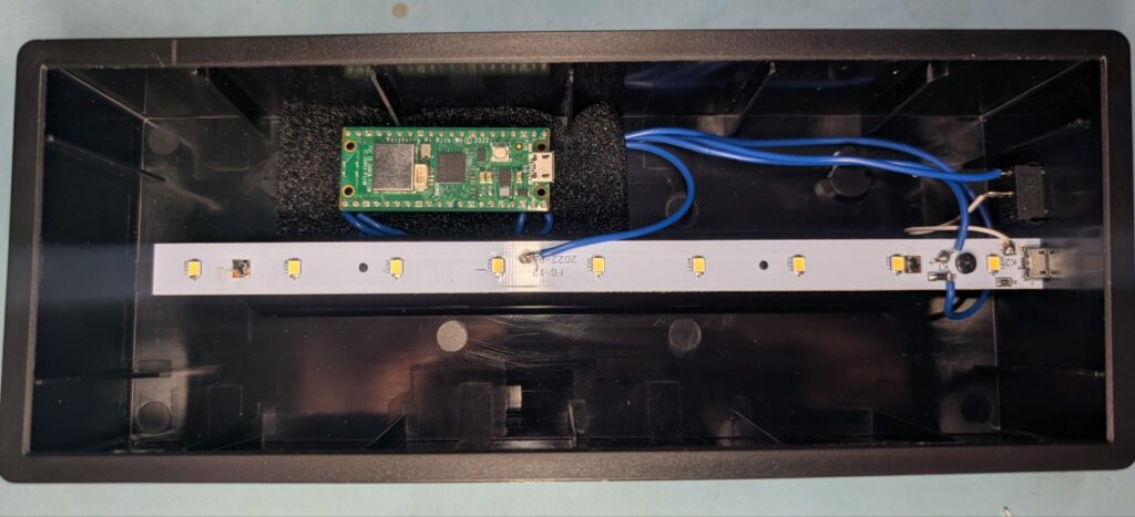 The Pico fits inside the enclosure surprisingly well — in fact, there’s ample room left over for additional hardware if you wanted to extend the project further. Electrically, the modification was fairly straightforward. I tapped into the main power feed from the micro-USB connector on the side of the sign, then cut the 0 V return track to the LED strip and routed it through GPIO pins on the Pico. The original AA battery compartment still works too, so the sign can be powered either via USB or batteries.